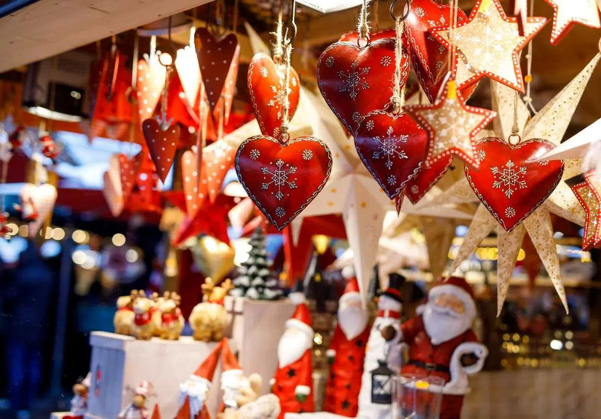 A hanging array of Christmas ornaments at a seasonal market.